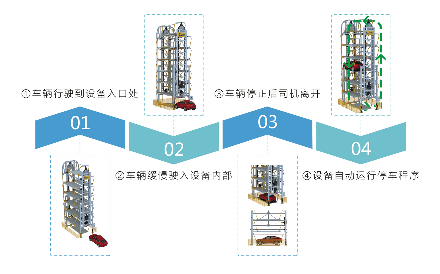 1.每層搬運(yùn)器和升降機(jī)分別動(dòng)作,互不干擾,提高了車(chē)輛出入庫(kù)的速度